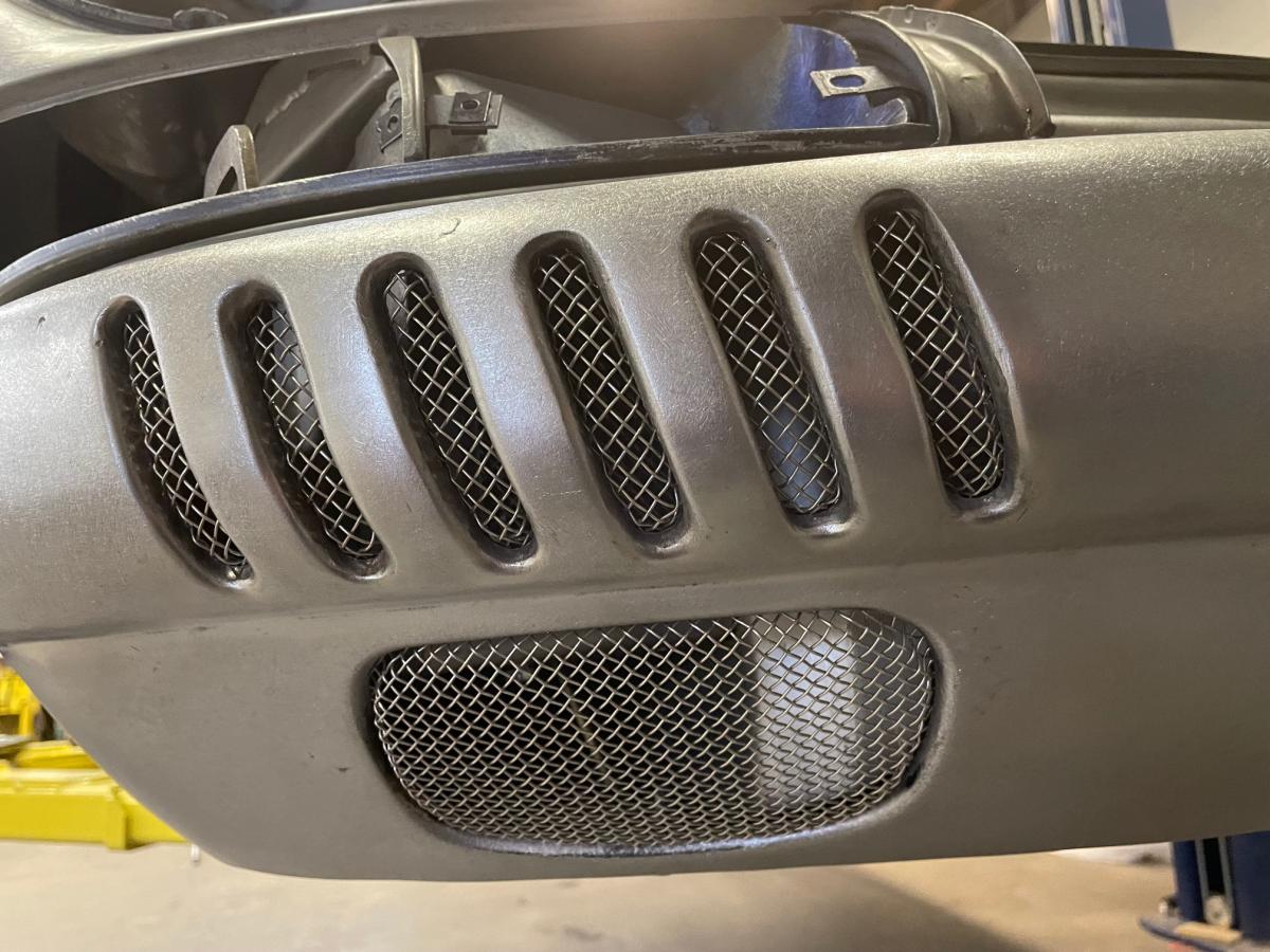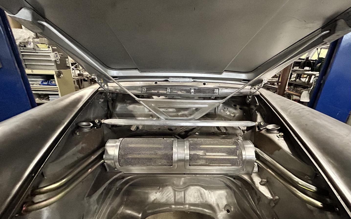 2. Duel oil cooler crossover lines cut and 200 degree Mocal thermostat installed. Oil will go through only one front cooler tell the oil hits 200 degrees. Oil crossover lines covered to protect the thermostat. A very light gauge Aluminum hood with a support that snaps at the rear of the hood when not in use. When in use it snaps to the strut brace.